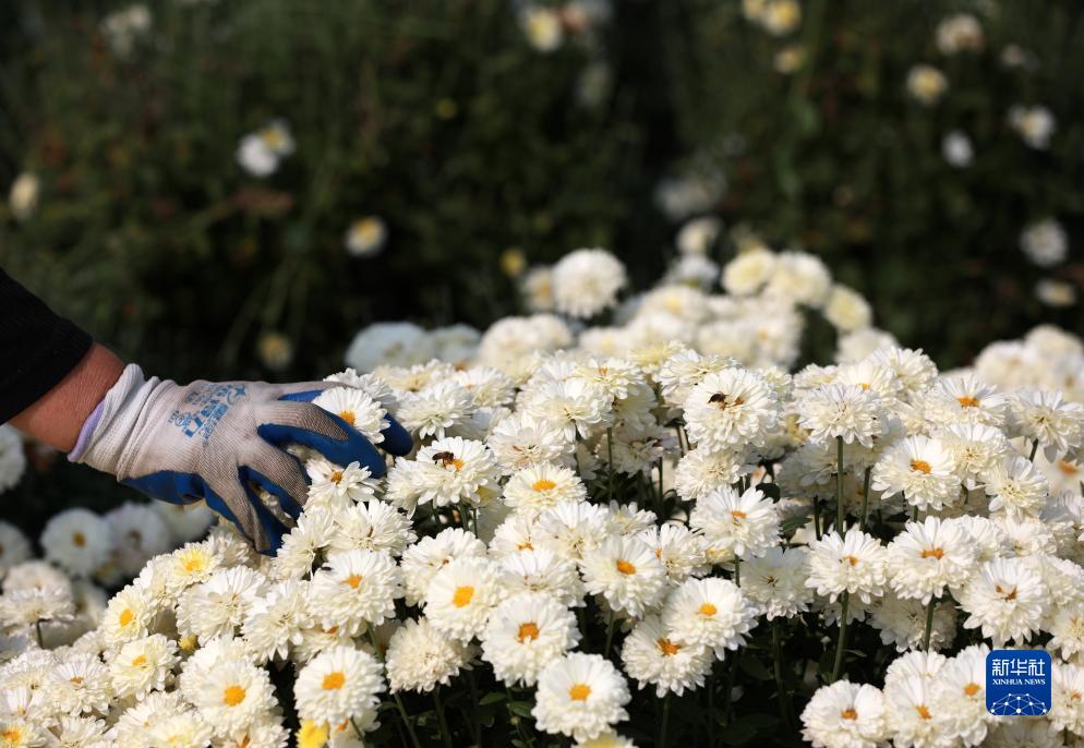 10月8日,在邢臺市任澤區大屯鄉的一處菊花種植基地,村民收獲菊花。