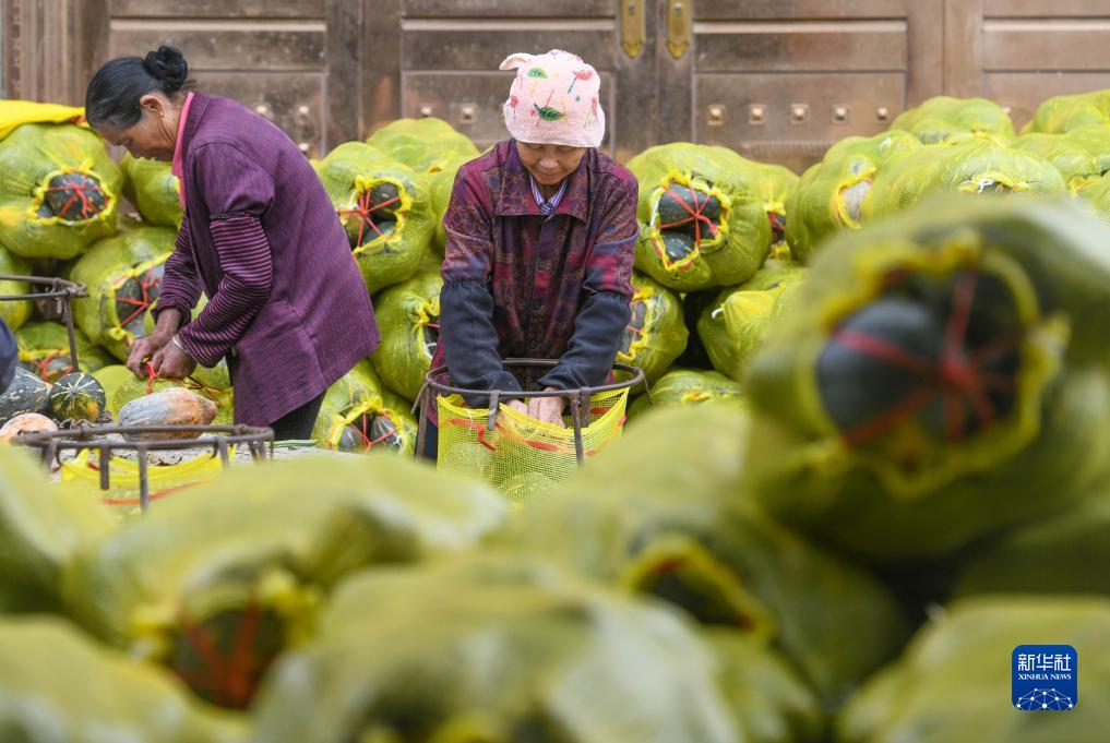 10月8日,在湖南省永州市道縣四馬橋鎮昌瑞瑤寨蔬菜種植基地,村民將收獲的南瓜打包。