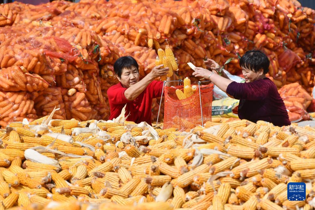 10月8日,河北省邯鄲市永年區東楊莊鎮許莊村的農民將玉米裝袋,準備晾曬。
