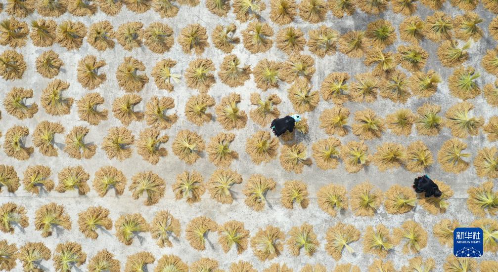 10月8日,村民在貴州省黔東南苗族侗族自治州從江縣剛邊壯族鄉剛邊村晾曬剛收獲的糯稻(無人機照片)。