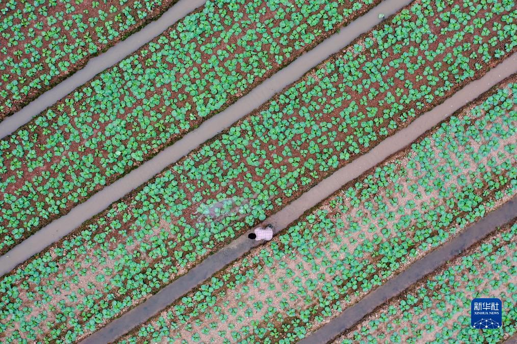 10月8日,湖南省衡陽縣西渡鎮新橋村村民在給蔬菜澆水(無人機照片)。