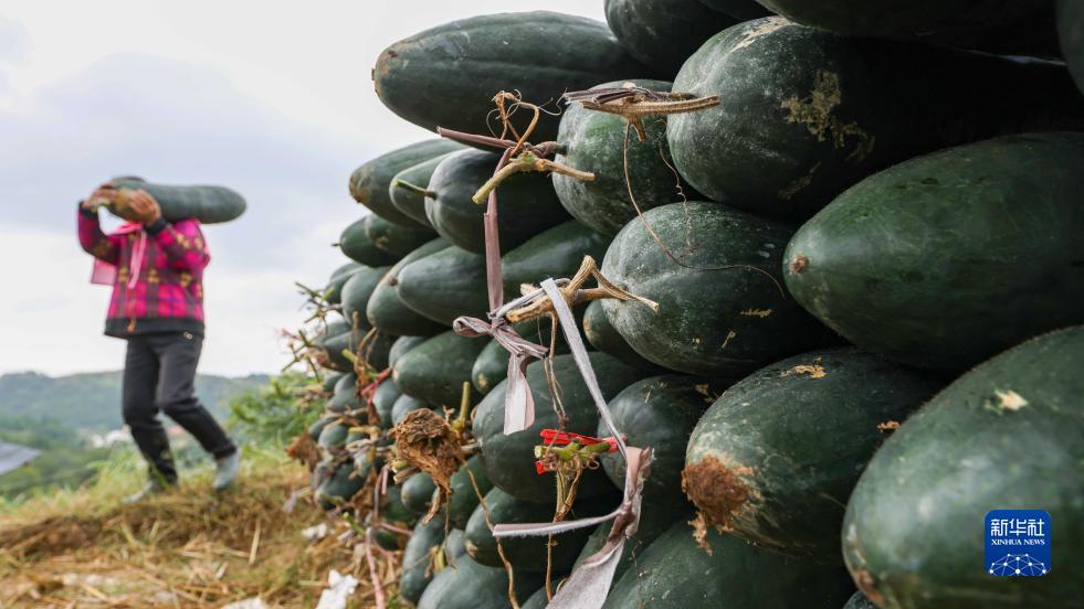 寒露時節,貴州省玉屏侗族自治縣種植的冬瓜進入成熟采收期,農民忙著采收、搬運、裝車,田間地頭一派豐收的喜人景象。