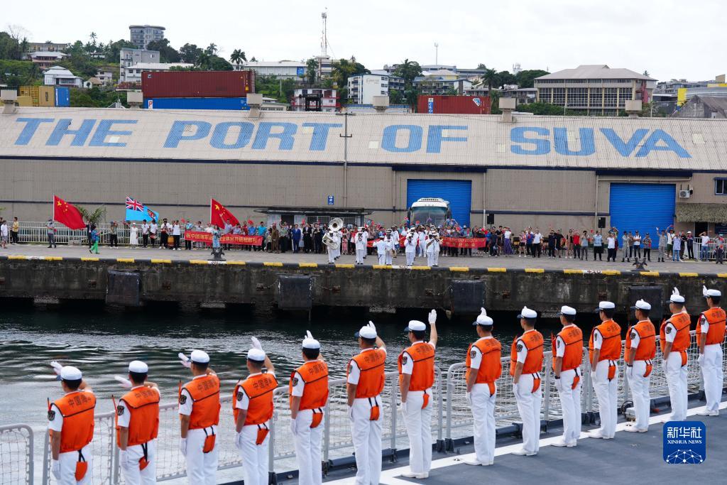 10月8日,人們在斐濟蘇瓦港國王碼頭為中國人民解放軍海軍戚繼光艦官兵送行。