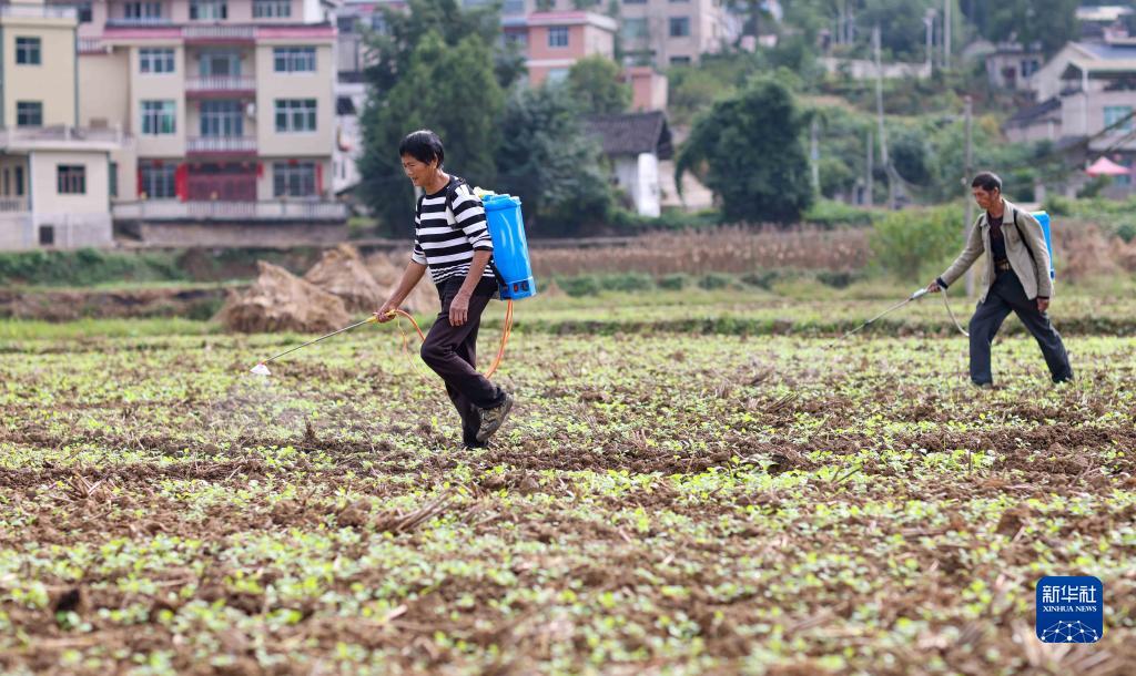 10月9日,在貴州省銅仁市玉屏侗族自治縣平溪街道楊柳村,農民在油菜育苗基地給油菜苗殺蟲。
