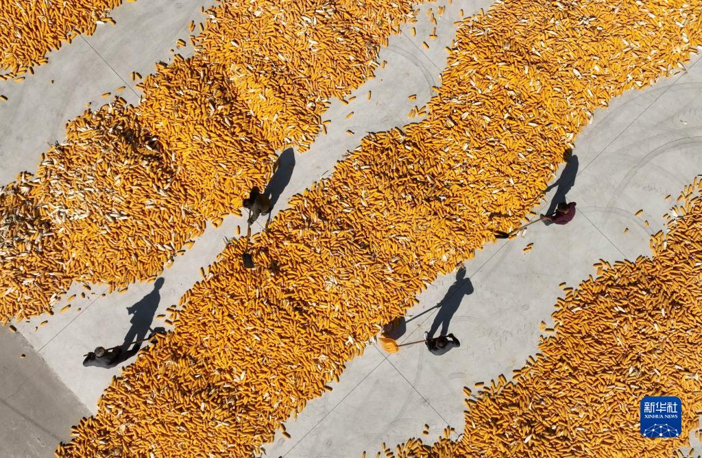 10月9日,河北省晉州市周家莊鄉的農民晾曬收獲的玉米(無人機照片)。