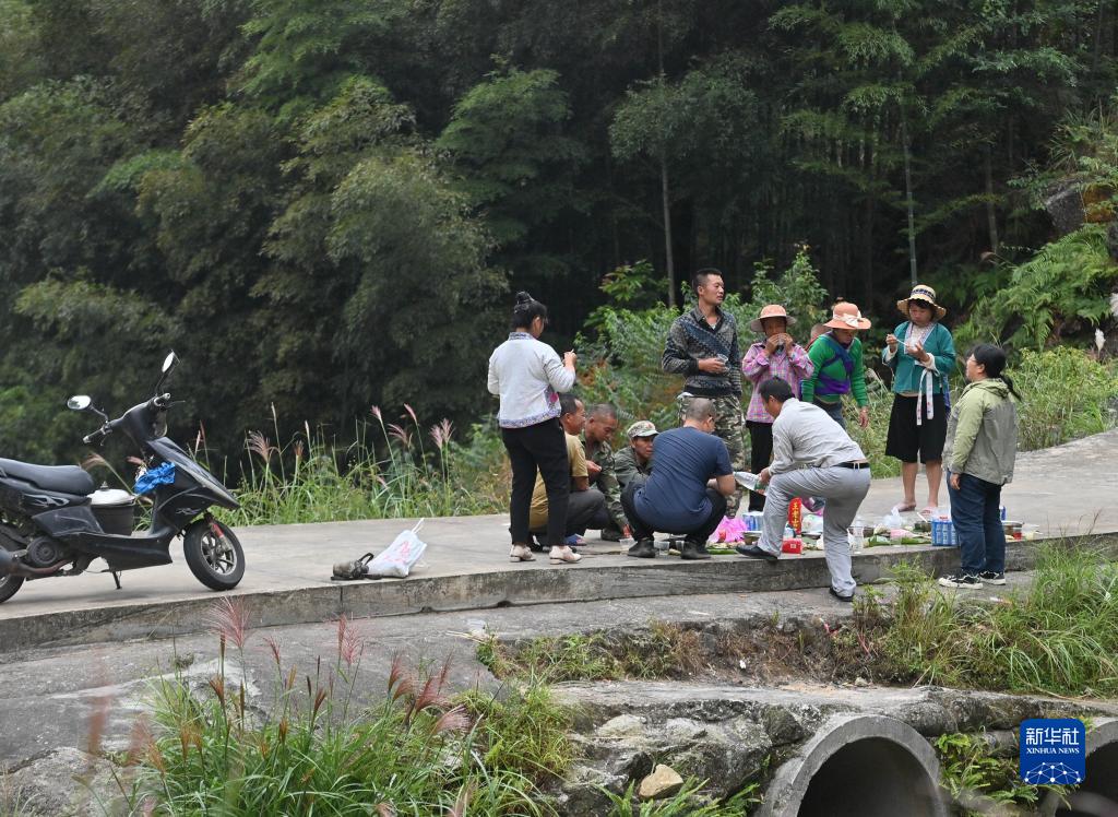 楊寧(右一)和鄰村(吉曼村)村民們在田邊一邊吃午飯,一邊協商山泉水引水工程相關事宜(10月8日攝)。新華社記者 黃孝邦 攝