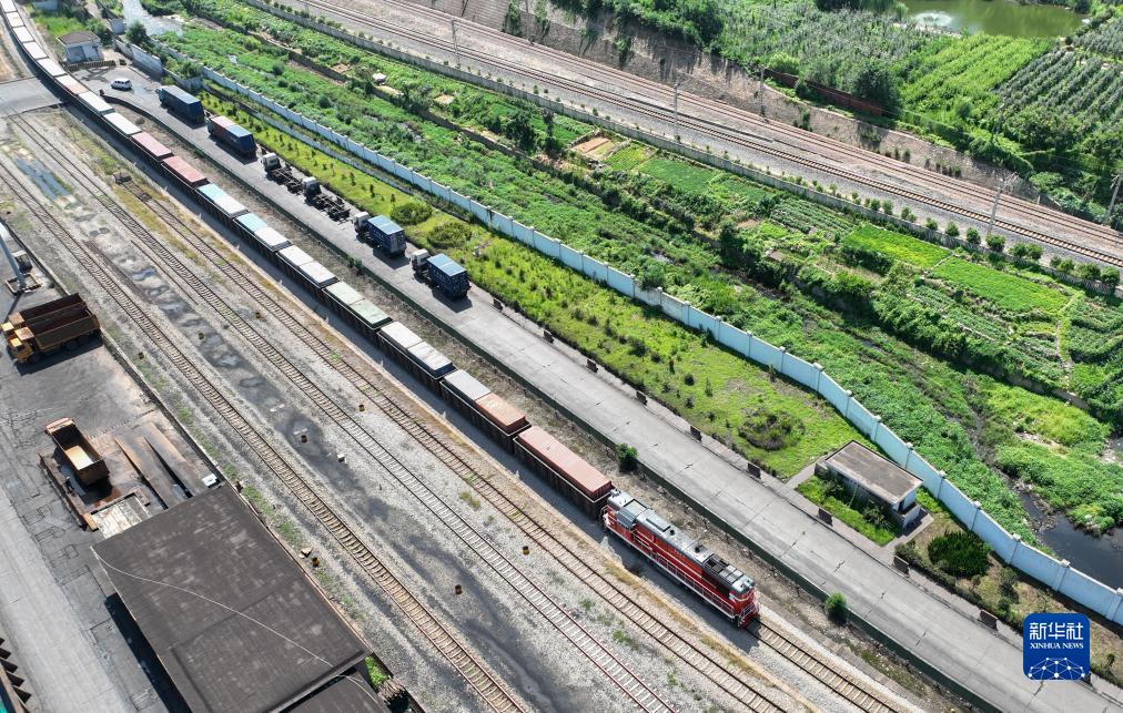 4月28日,一列中歐班列從中哈連云港物流合作基地駛出(無人機照片)。
