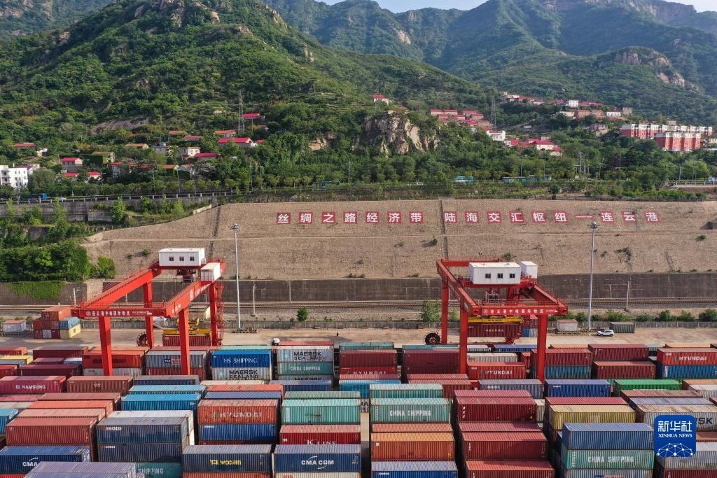 5月9日,在中哈連云港物流合作基地,龍門吊在吊裝集裝箱(無人機照片)。