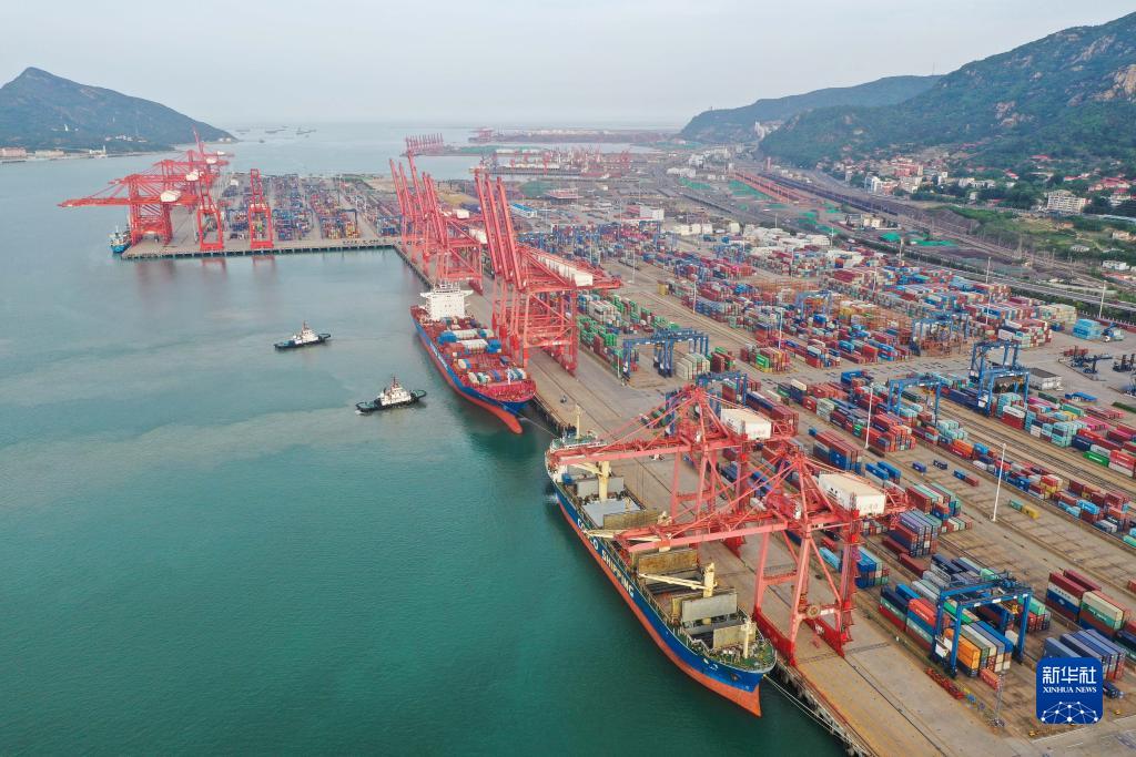 5月9日,貨輪??吭谶B云港港集裝箱碼頭(無人機照片)。