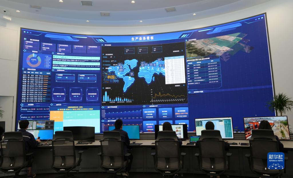 5月9日,工作人員在江蘇連云港的中哈連云港物流合作基地數字化調度中心查看港口作業情況。