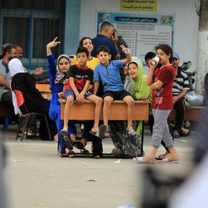 10月9日,巴勒斯坦人在加沙地帶南部城市汗尤尼斯的一所學校躲避以色列空襲。