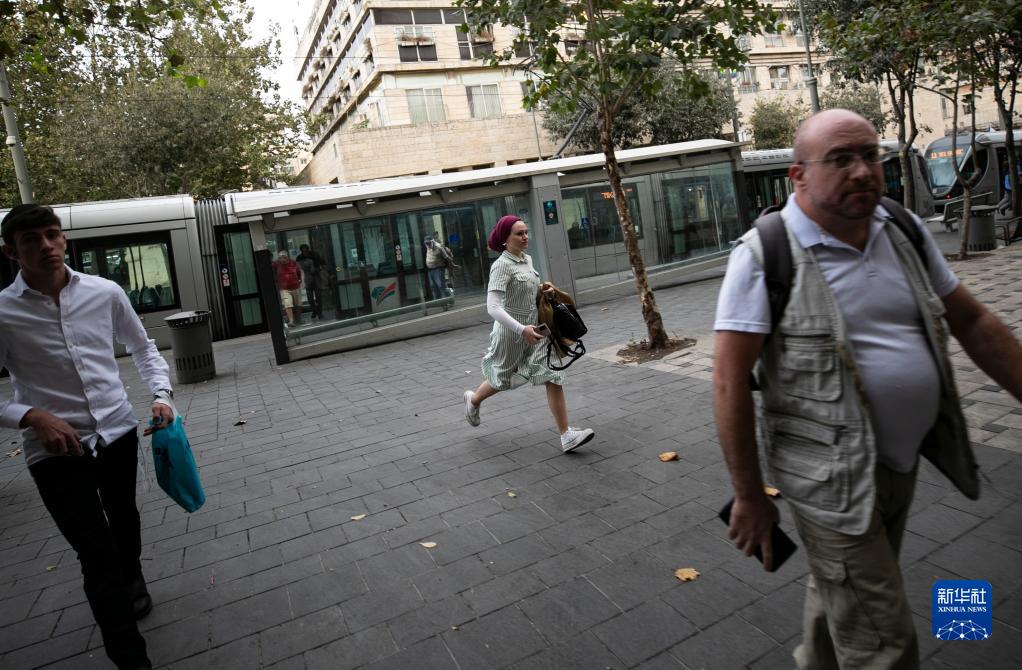 10月9日,在耶路撒冷街頭,人們在防空警報響起時沖向避難設施。