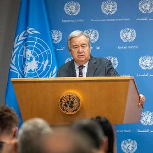 10月9日,在位于紐約的聯合國總部,聯合國秘書長古特雷斯在記者會上就巴以局勢發表談話。