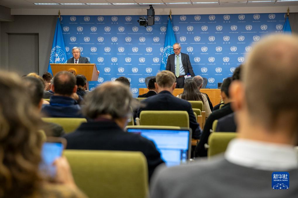 10月9日,在位于紐約的聯合國總部,聯合國秘書長古特雷斯(后左)在記者會上就巴以局勢發表談話。