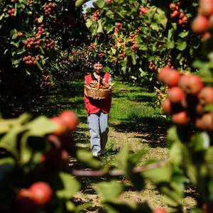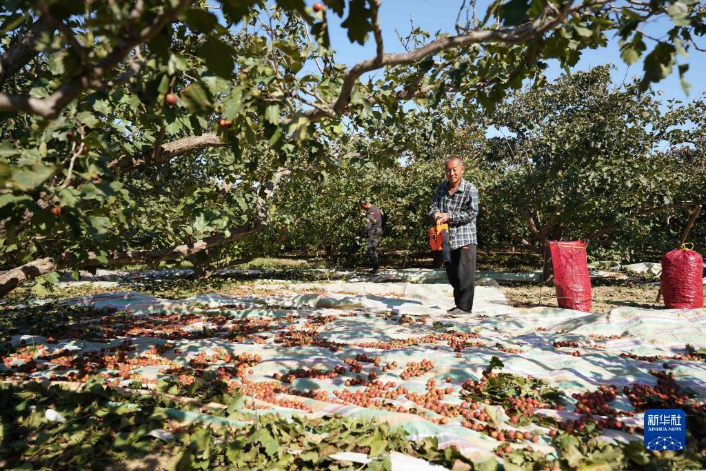 10月9日,河北省清河縣花園村村民在山楂林里勞作。