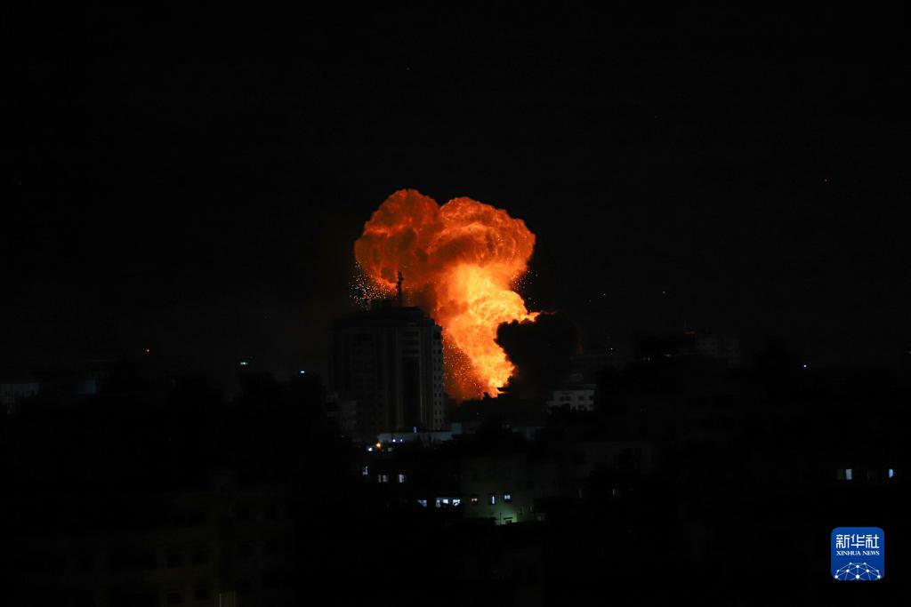 這是10月9日晚在加沙城拍攝的以色列軍隊空襲產生的火光。