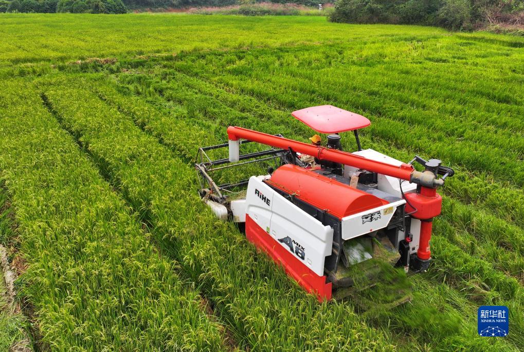 10月10日,農機手駕駛收割機在湖南省靖州苗族侗族自治縣甘棠鎮溪口村收割制種水稻(無人機照片)。