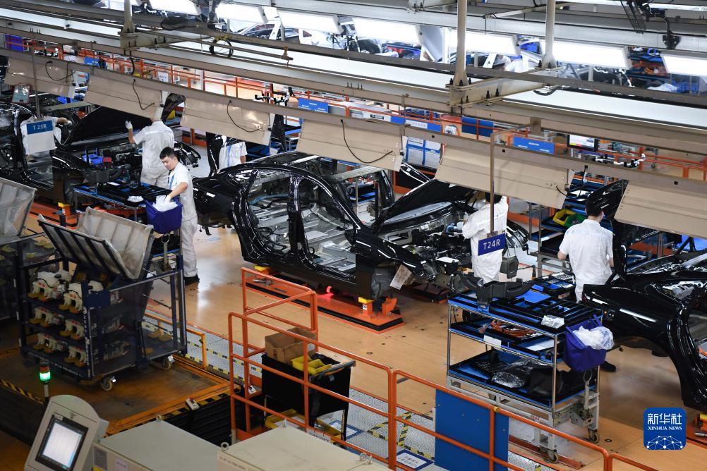 10月9日,工作人員在廣東肇慶小鵬汽車智能網聯科技產業園內的總裝生產線上工作。