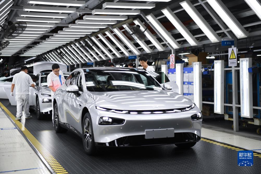 10月9日,工作人員在廣東肇慶小鵬汽車智能網聯科技產業園內總裝車間查看即將下線的整車。