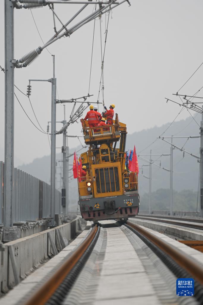 10月10日,中國中鐵電氣化局施工人員在杭溫鐵路上進行接觸網導線架設作業。