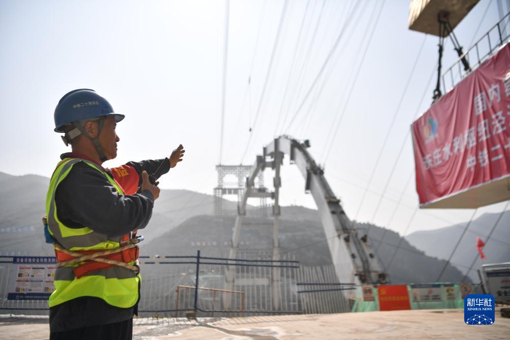 10月10日,中鐵二十局工人在陜西東莊水利樞紐涇河大橋施工現場指揮吊機進行吊裝作業。