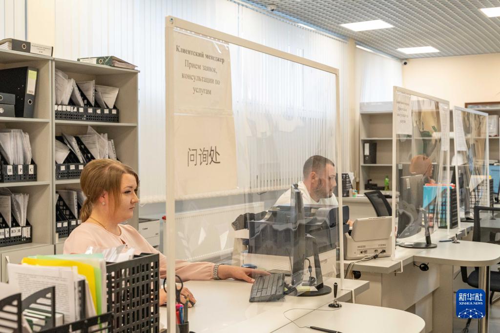 7月24日,工作人員在俄羅斯布拉戈維申斯克卡尼庫爾干海關物流口岸辦事區工作。