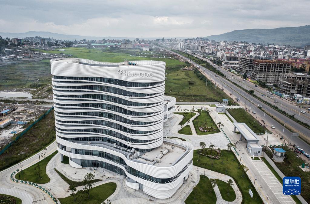 這是2023年9月10日在埃塞俄比亞首都亞的斯亞貝巴拍攝的非洲疾控中心總部大樓(無人機照片)。中國援非盟非洲疾病預防控制中心總部(一期)項目于2023年1月竣工,這是非洲大陸第一個擁有現代化辦公和實驗條件、設施完善的全非疾控中心。