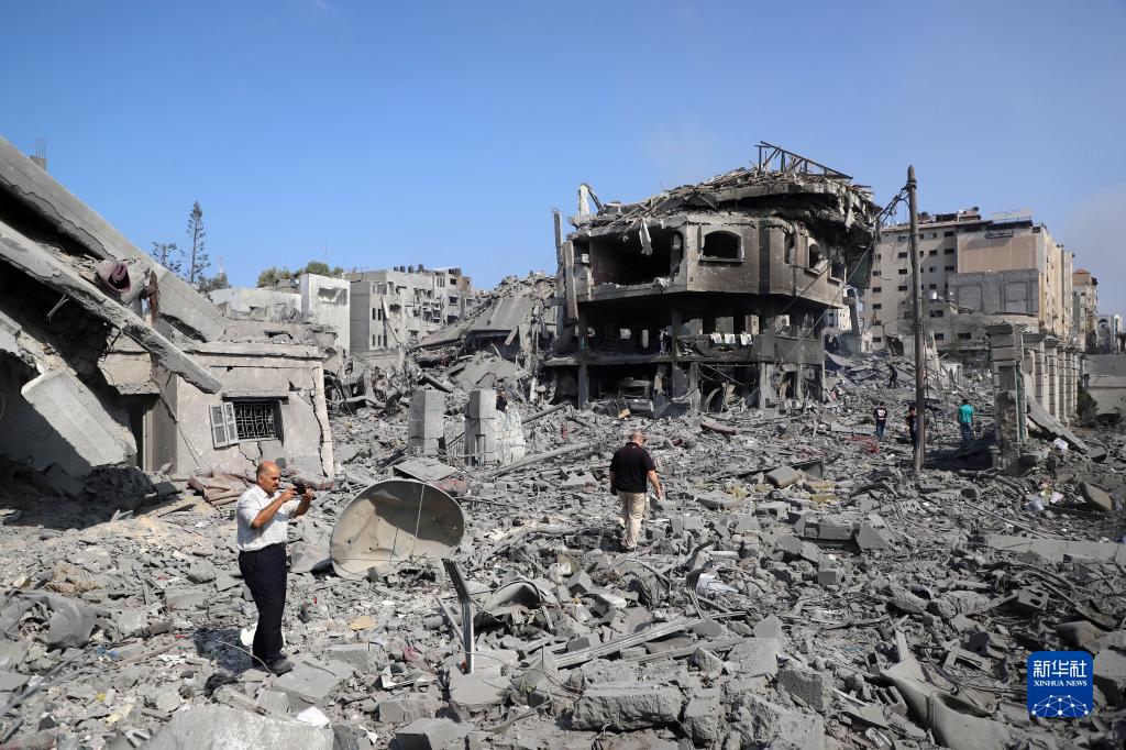 10月10日,在加沙城,人們查看被以色列空襲炸毀的建筑廢墟。