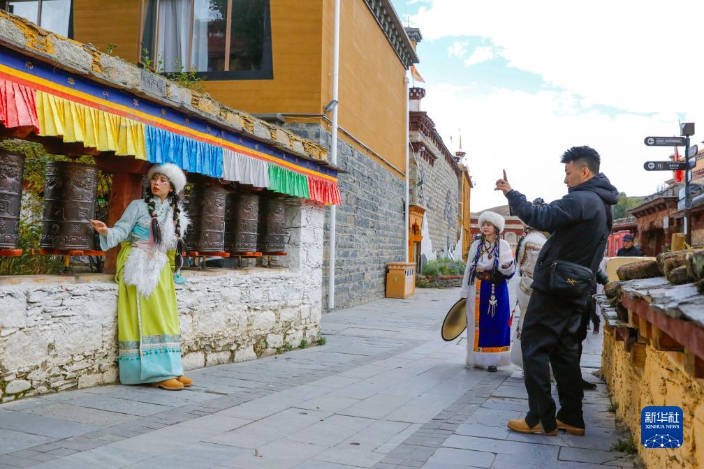 10月10日,游客在理塘縣勒通古鎮拍藏族風情寫真。