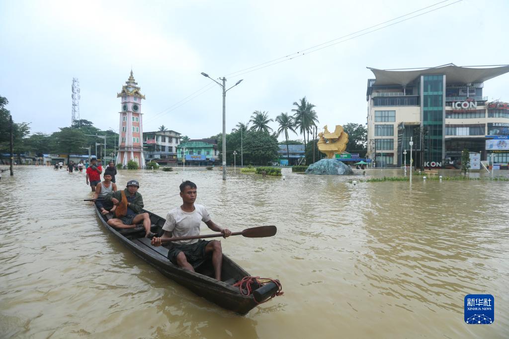 10月10日,在緬甸勃固地區,人們在積水的道路上乘船出行。