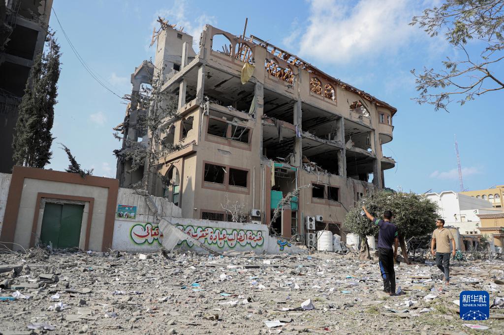 10月10日,在加沙城,人們走過被以色列空襲炸毀的建筑廢墟。