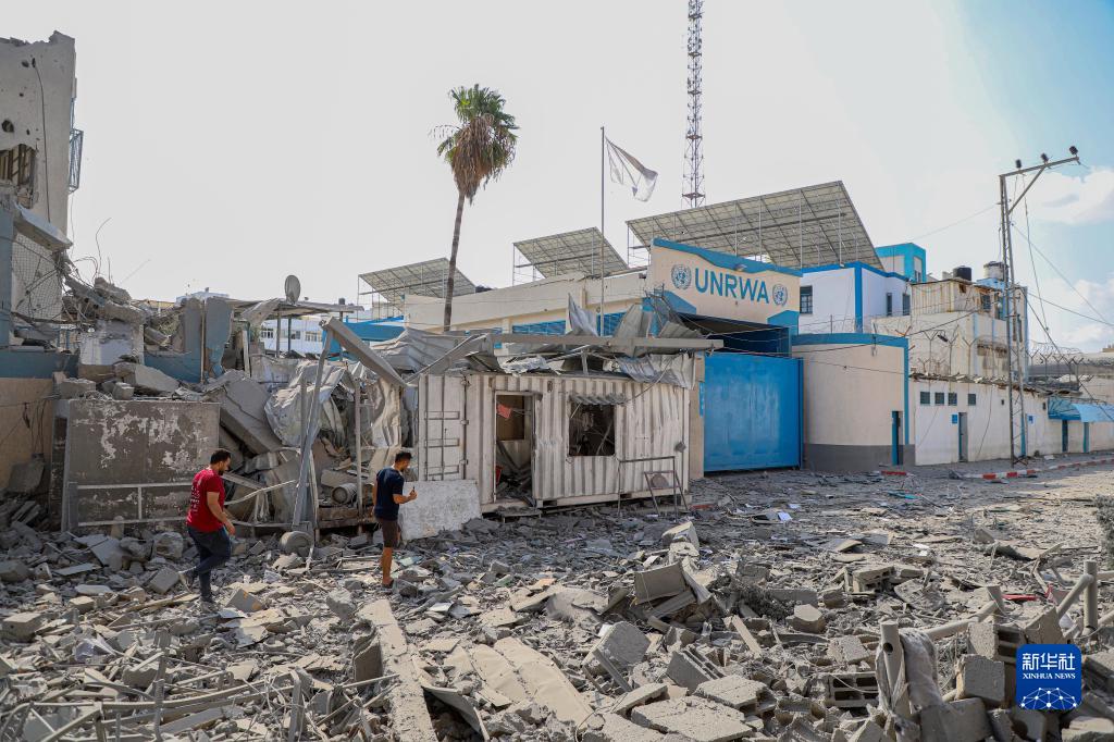 10月10日,在加沙城,人們走過被以色列空襲炸毀的建筑廢墟。