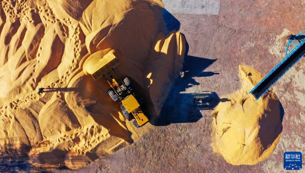 在內蒙古通遼市奈曼旗新鎮舍布日圖嘎查,工人在收糧站晾曬玉米(2022年10月18日攝,無人機照片)。