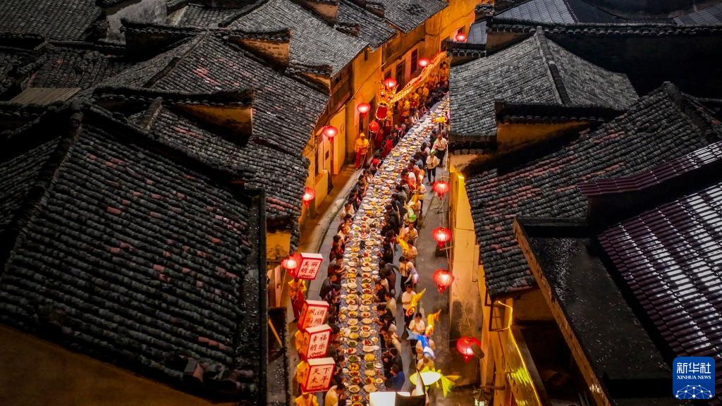 村民舞著龍燈經過安徽省寧國市胡樂鎮老街上舉辦的長桌宴(2023年6月16日攝,無人機照片)。