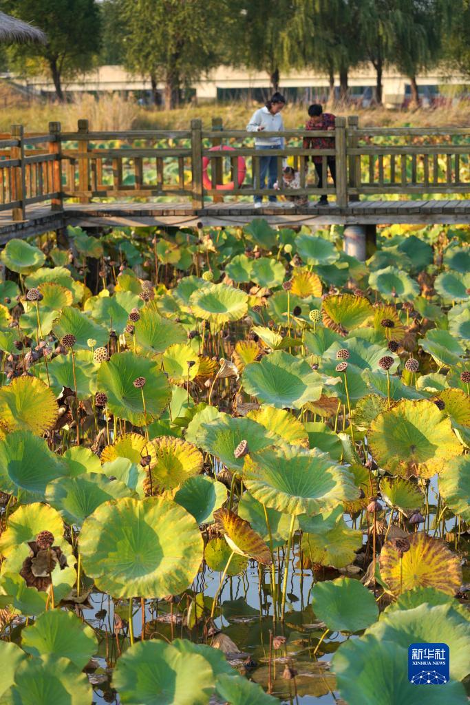 10月10日,游客在山東聊城位山黃河公園里游覽。