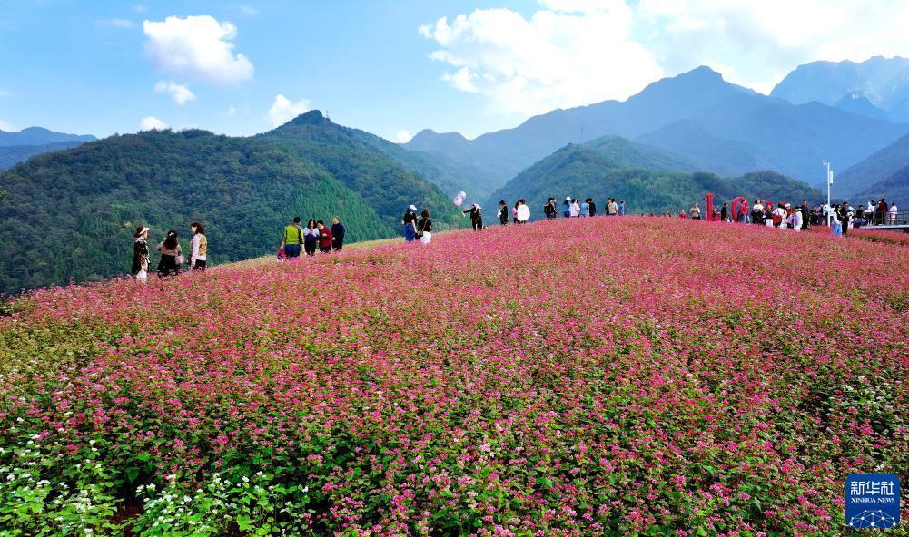 10月10日,游人在陜西省西安市藍田縣九間房鎮峪口村蕎麥嶺賞花游玩(無人機照片)。