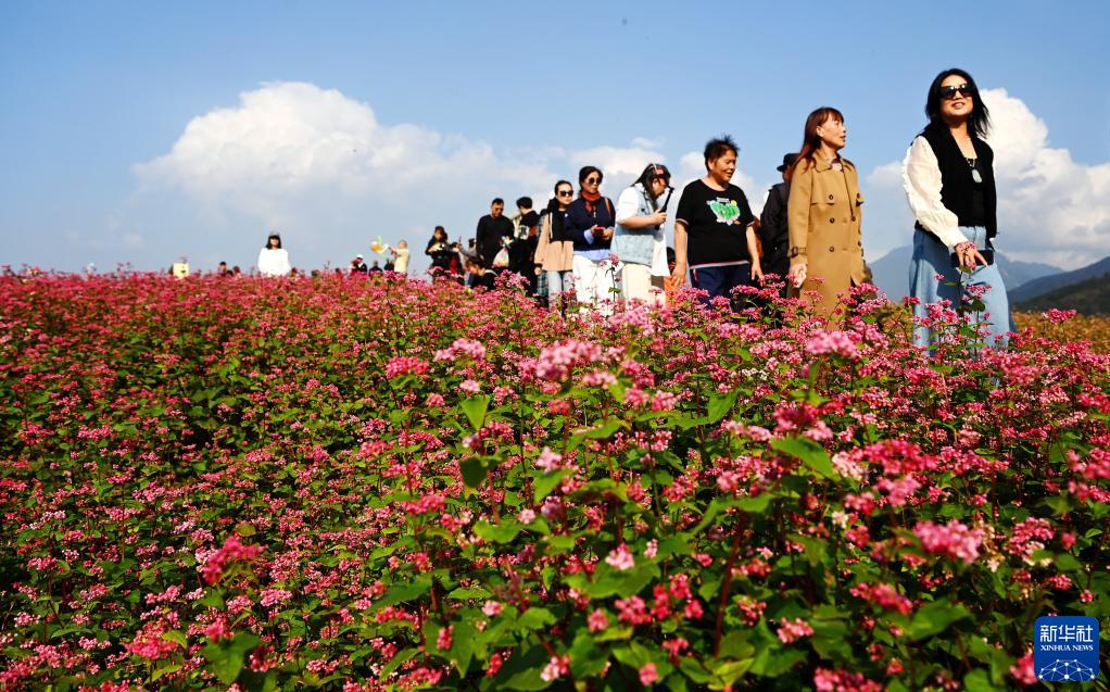 10月10日,游人在陜西省西安市藍田縣九間房鎮峪口村蕎麥嶺賞花游玩。