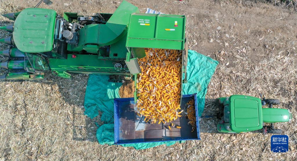 10月11日,在吉林省公主嶺市范家屯鎮乾程農民專業合作社,農民操作農機收獲玉米(無人機照片)。