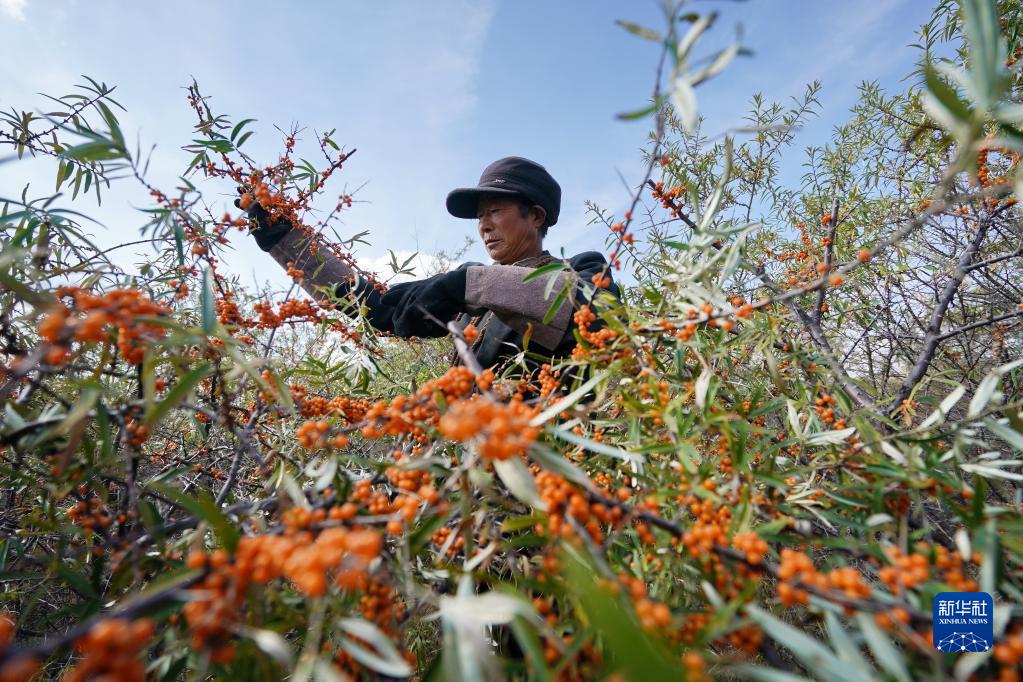 10月11日,沽源縣小廠鎮農民在采摘沙棘果。