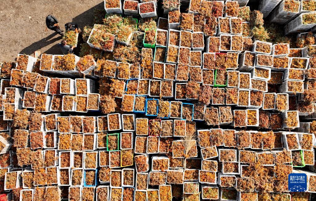 10月11日,沽源縣一家農業開發企業的工人在整理收購的沙棘果(無人機照片)。