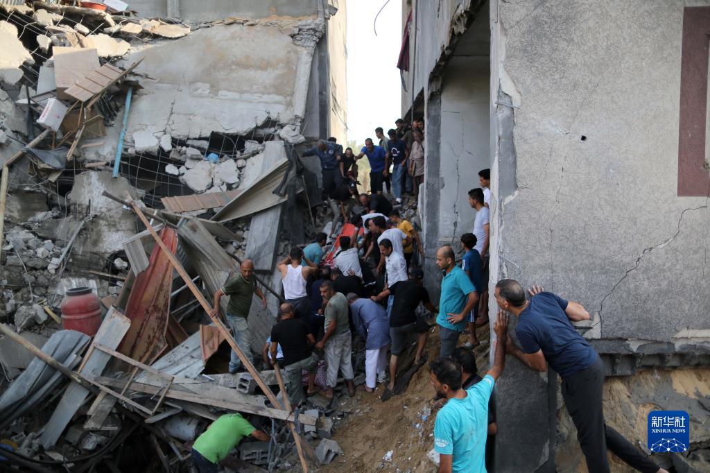 10月11日,在加沙地帶南部城市汗尤尼斯,人們在被以色列空襲摧毀的建筑廢墟中尋找幸存者。