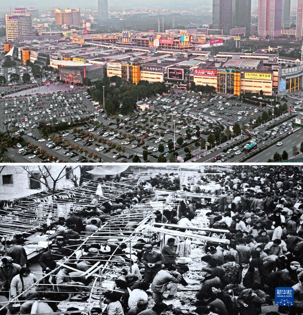 這是一張拼版照片,上圖為:2018年10月24日拍攝的義烏國際商貿城一區市場(新華社記者譚進攝);下圖為:1982年9月開業的義烏第一代小商品市場的資料照片(新華社發)。