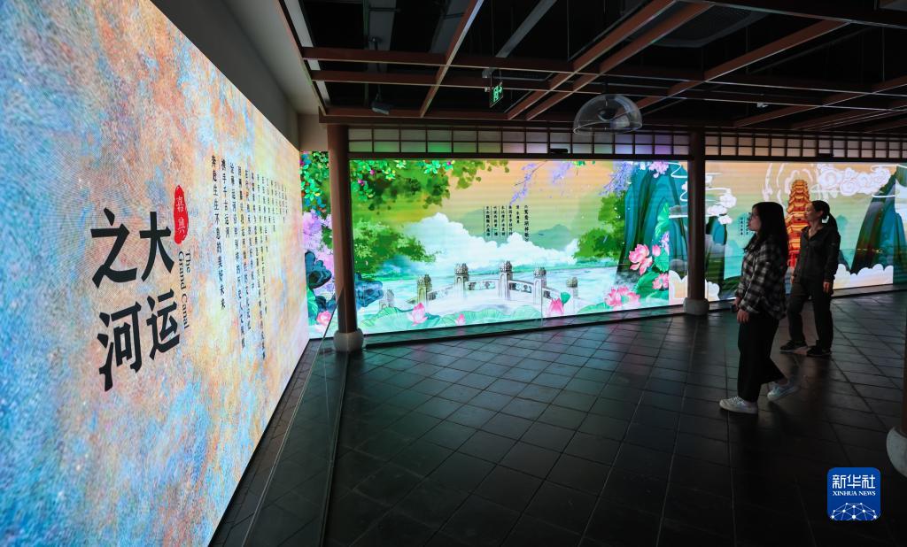 10月11日,游客在大運河數字詩路e站內觀看數字化呈現的大運河相關詩詞及景色。