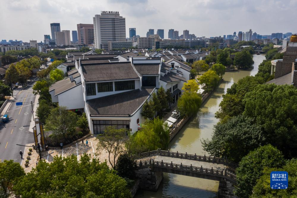 10月11日拍攝的大運河畔的嘉興南湖大運河數字詩路e站南湖體驗中心(無人機照片)。