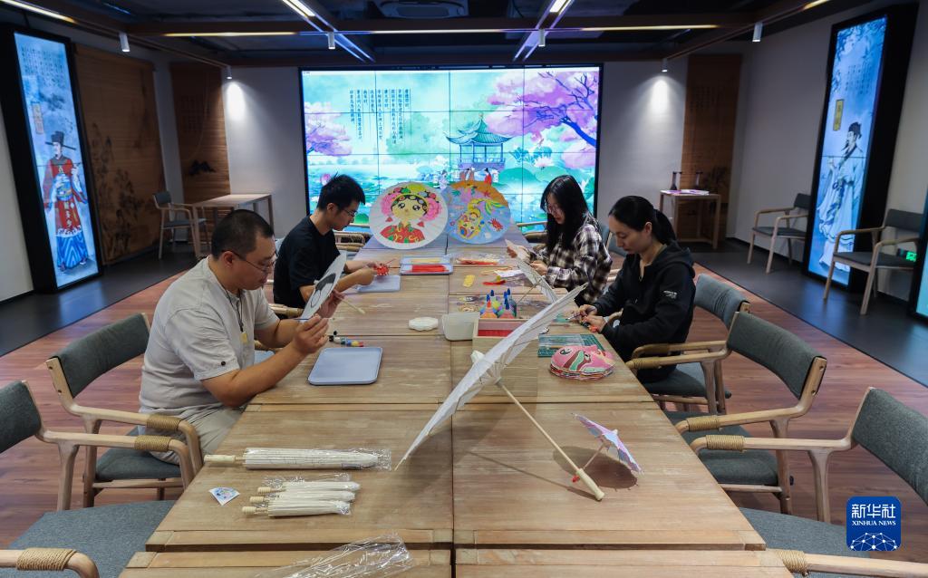 10月11日,游客在大運河數字詩路e站的互動功能區內體驗傳統紙扇繪制。