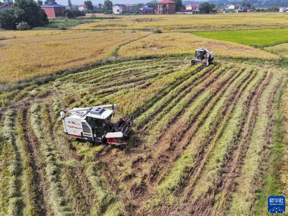 金秋時節,湖南省長沙市望城區烏山街道維梓村種植的中稻迎來收獲季,當地農戶搶抓農時收割水稻、烘干稻谷,確保顆粒歸倉。
