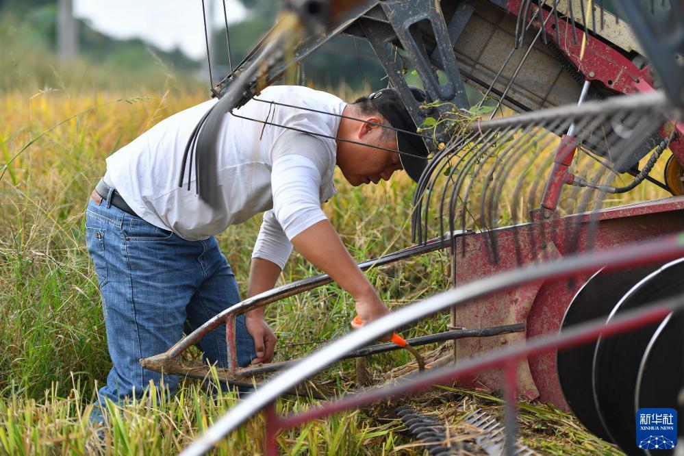 10月11日,在湖南省長沙市望城區烏山街道維梓村,農戶在檢查收割機。