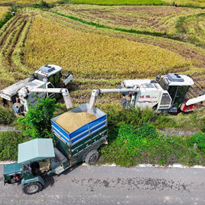 金秋時節,湖南省長沙市望城區烏山街道維梓村種植的中稻迎來收獲季,當地農戶搶抓農時收割水稻、烘干稻谷,確保顆粒歸倉。