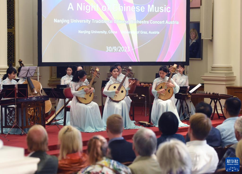 9月30日,在奧地利格拉茨,南京大學民族樂團成員在演奏《絲路駝鈴》。當日,南京大學民族樂團在奧地利格拉茨舉辦“絲路華韻”音樂會,為現場觀眾帶來具有濃郁中國特色的藝術盛宴,慶祝中秋佳節。