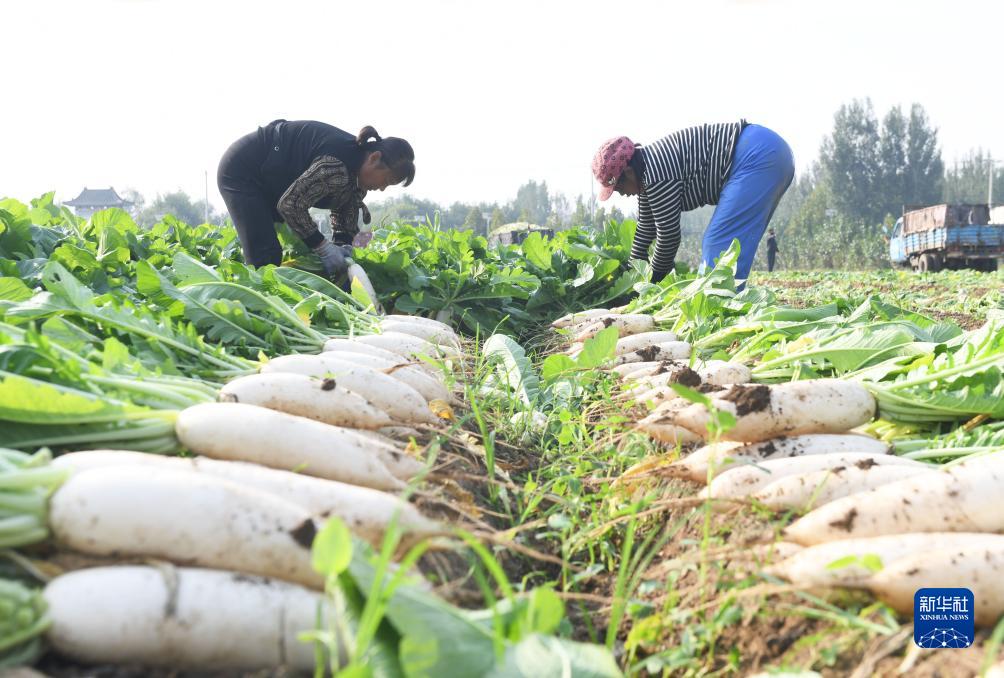 10月11日,河北省石家莊新樂市堅固村農民在收獲白蘿卜。